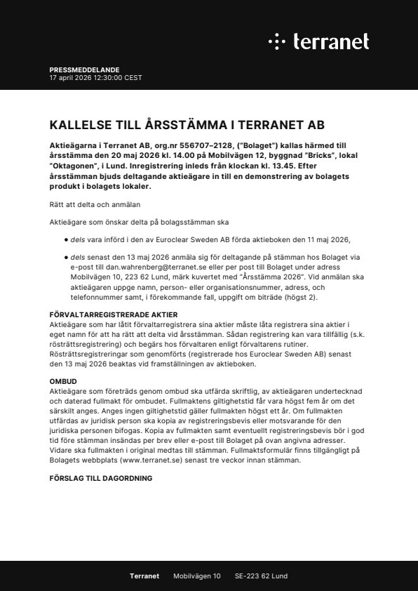Aktieägarna i Terranet AB, org.nr 556707–2128, (”Bolaget”) kallas härmed till årsstämma den 20 maj 2026 kl. 14.00 på Mobilvägen 12, byggnad ”Bricks”, lokal ”Oktagonen”, i Lund. Inregistrering inleds från klockan kl. 13.45. Efter årsstämman bjuds deltagande aktieägare in till en demonstrering av bolagets produkt i bolagets lokaler.