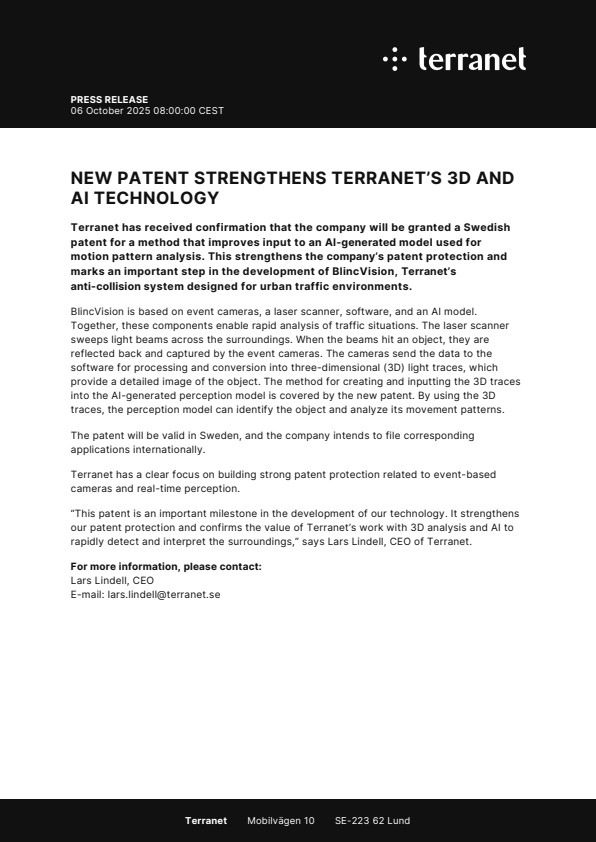 Terranet has received confirmation that the company will be granted a Swedish patent for a method that improves input to an AI-generated model used for motion pattern analysis. This strengthens the company’s patent protection and marks an important step in the development of BlincVision, Terranet’s anti-collision system designed for urban traffic environments.