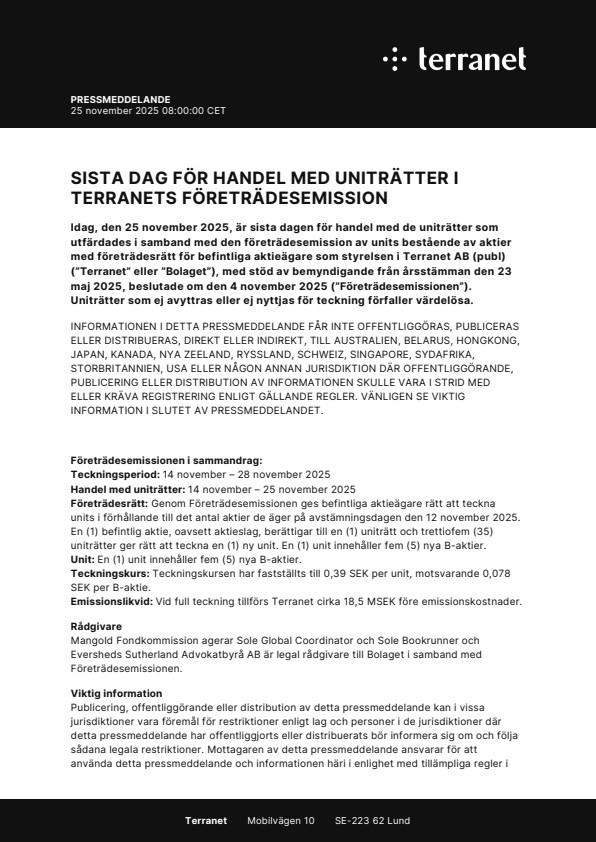 Idag, den 25 november 2025, är sista dagen för handel med de uniträtter som utfärdades i samband med den företrädesemission av units bestående av aktier med företrädesrätt för befintliga aktieägare som styrelsen i Terranet AB (publ) (”Terranet” eller ”Bolaget”), med stöd av bemyndigande från årsstämman den 23 maj 2025, beslutade om den 4 november 2025 (”Företrädesemissionen”). Uniträtter som ej avyttras eller ej nyttjas för teckning förfaller värdelösa.
