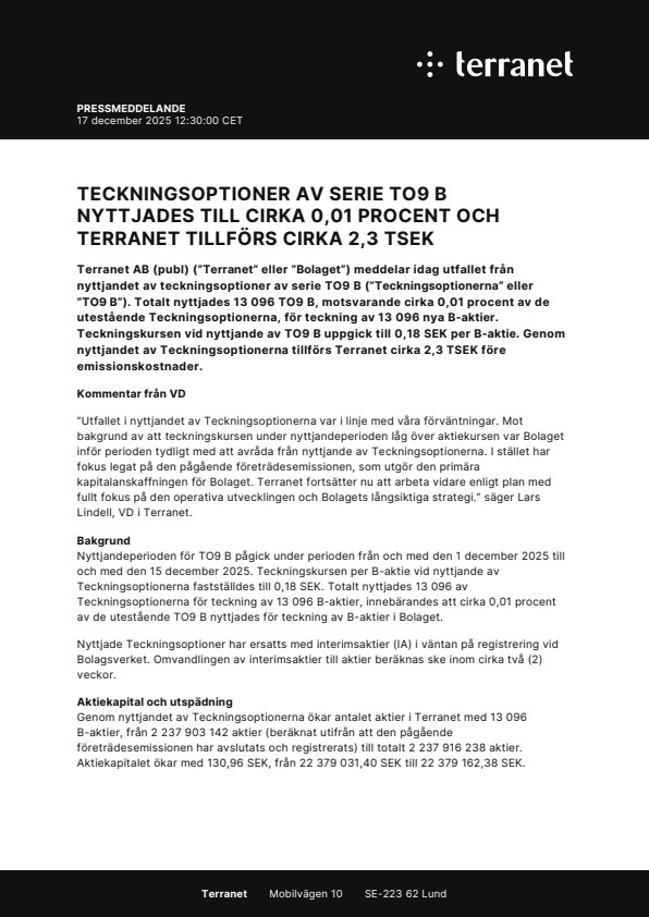 Terranet AB (publ) (”Terranet” eller ”Bolaget”) meddelar idag utfallet från nyttjandet av teckningsoptioner av serie TO9 B (”Teckningsoptionerna” eller ”TO9 B”). Totalt nyttjades 13 096 TO9 B, motsvarande cirka 0,01 procent av de utestående Teckningsoptionerna, för teckning av 13 096 nya B-aktier. Teckningskursen vid nyttjande av TO9 B uppgick till 0,18 SEK per B-aktie. Genom nyttjandet av Teckningsoptionerna tillförs Terranet cirka 2,3 TSEK före emissionskostnader.