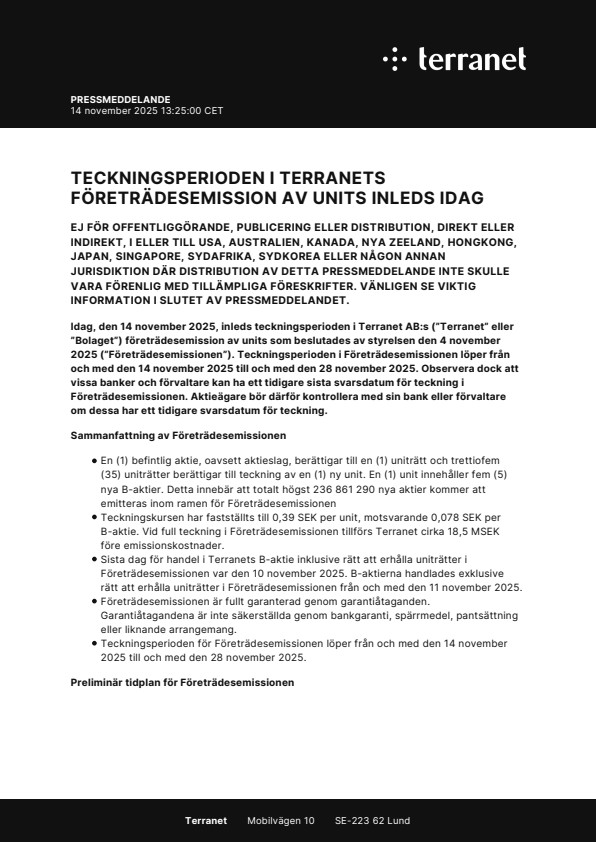 Idag, den 14 november 2025, inleds teckningsperioden i Terranet AB:s (”Terranet” eller ”Bolaget”) företrädesemission av units som beslutades av styrelsen den 4 november 2025 (”Företrädesemissionen”). Teckningsperioden i Företrädesemissionen löper från och med den 14 november 2025 till och med den 28 november 2025. Observera dock att vissa banker och förvaltare kan ha ett tidigare sista svarsdatum för teckning i Företrädesemissionen. Aktieägare bör därför kontrollera med sin bank eller förvaltare om dessa har ett tidigare svarsdatum för teckning.