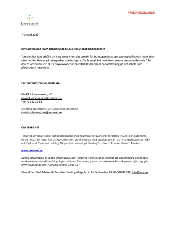 Denna information är sådan information som TerraNet Holding AB är skyldigt att offentliggöra enligt EU:s marknadsmissbruksförordning. Informationen lämnades, genom ovanstående kontaktpersons försorg, för offentliggörande den 7 januari 2020 kl 23:15 CET