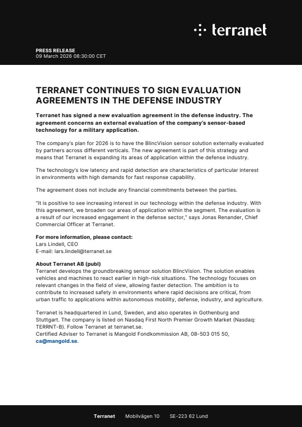 “It is positive to see increasing interest in our technology within the defense industry. With this agreement, we broaden our areas of application within the segment. The evaluation is a result of our increased engagement in the defense sector,” says Jonas Renander, Chief Commercial Officer at Terranet.
