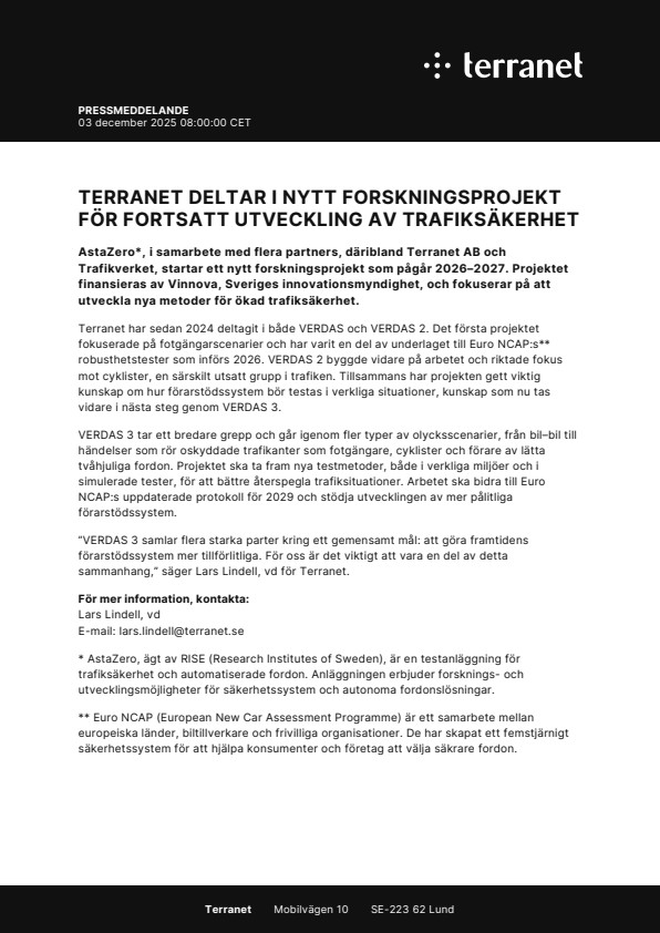 ”VERDAS 3 samlar flera starka parter kring ett gemensamt mål: att göra framtidens förarstödssystem mer tillförlitliga. För oss är det viktigt att vara en del av detta sammanhang,” säger Lars Lindell, vd för Terranet.