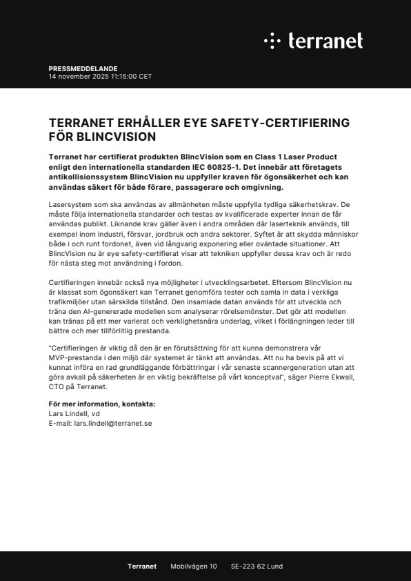 Terranet har certifierat produkten BlincVision som en Class 1 Laser Product enligt den internationella standarden IEC 60825-1. Det innebär att företagets antikollisionssystem BlincVision nu uppfyller kraven för ögonsäkerhet och kan användas säkert för både förare, passagerare och omgivning.