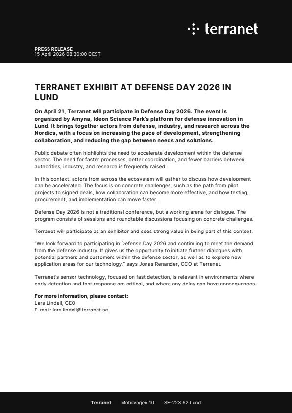 “We look forward to participating in Defense Day 2026 and continuing to meet the demand from the defense industry. It gives us the opportunity to initiate further dialogues with potential partners and customers within the defense sector, as well as to explore new application areas for our technology,” says Jonas Renander, CCO at Terranet.