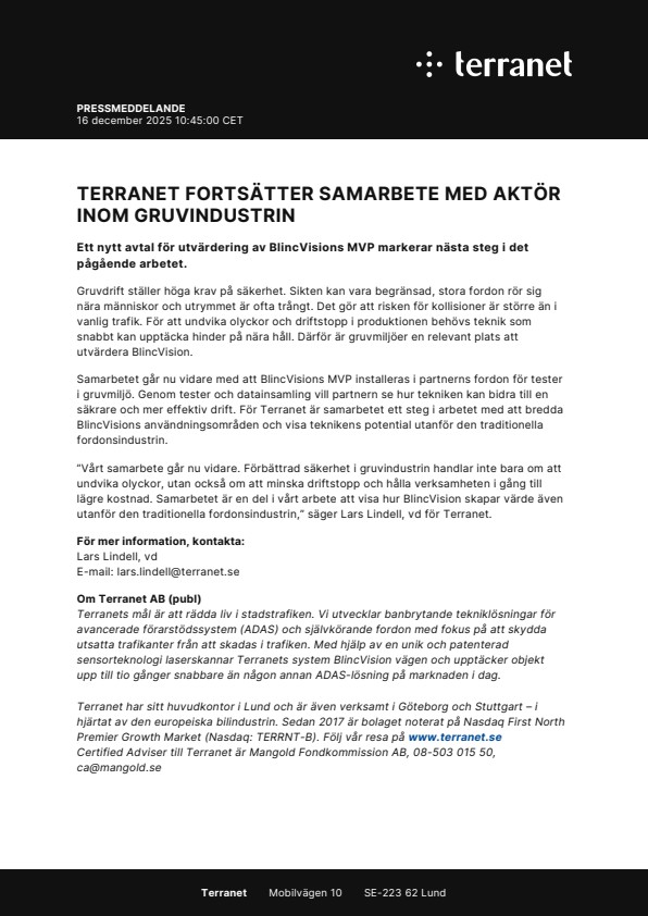 ”Vårt samarbete går nu vidare. Förbättrad säkerhet i gruvindustrin handlar inte bara om att undvika olyckor, utan också om att minska driftstopp och hålla verksamheten i gång till lägre kostnad. Samarbetet är en del i vårt arbete att visa hur BlincVision skapar värde även utanför den traditionella fordonsindustrin,” säger Lars Lindell, vd för Terranet.