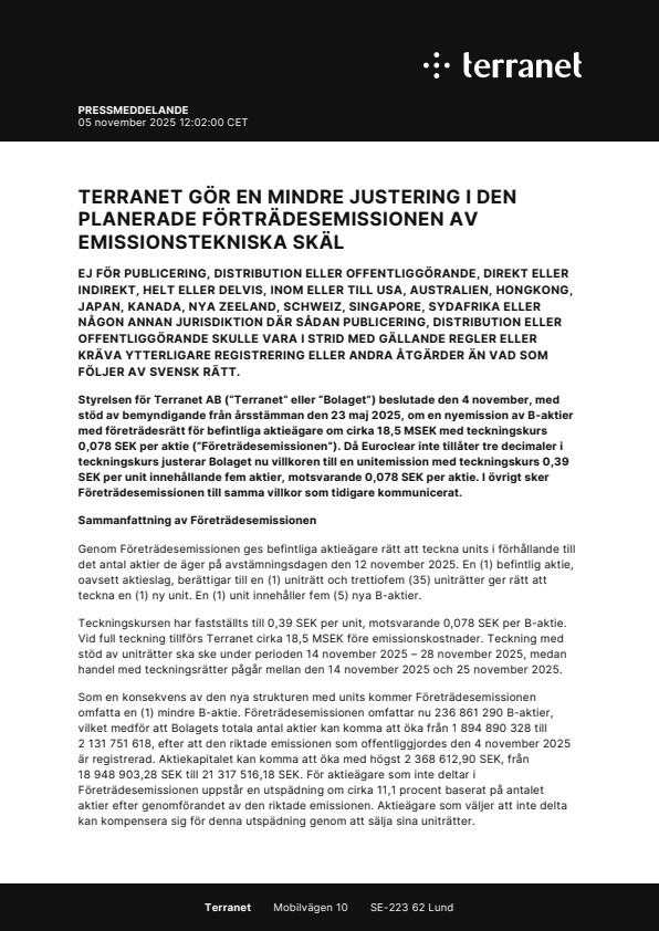 Styrelsen för Terranet AB (“Terranet” eller “Bolaget”) beslutade den 4 november, med stöd av bemyndigande från årsstämman den 23 maj 2025, om en nyemission av B-aktier med företrädesrätt för befintliga aktieägare om cirka 18,5 MSEK med teckningskurs 0,078 SEK per aktie (”Företrädesemissionen”). Då Euroclear inte tillåter tre decimaler i teckningskurs justerar Bolaget nu villkoren till en unitemission med teckningskurs 0,39 SEK per unit innehållande fem aktier, motsvarande 0,078 SEK per aktie. I övrigt sker Företrädesemissionen till samma villkor som tidigare kommunicerat.
