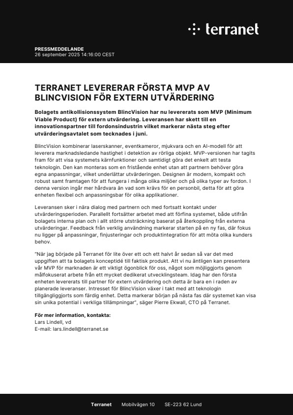 “När jag började på Terranet för lite över ett och ett halvt år sedan så var det med uppgiften att ta bolagets konceptidé till faktisk produkt. Att vi nu äntligen kan presentera vår MVP för marknaden är ett viktigt ögonblick för oss, något som möjliggjorts genom målfokuserat arbete från ett mycket dedikerat utvecklingsteam. Idag har den första enheten levererats till partner för extern utvärdering och detta är bara en i raden av planerade leveranser. Intresset för BlincVision växer i takt med att teknologin tillgängliggjorts som färdig enhet. Detta markerar början på nästa fas där systemet kan visa sin unika potential i verkliga tillämpningar”, säger Pierre Ekwall, CTO på Terranet.