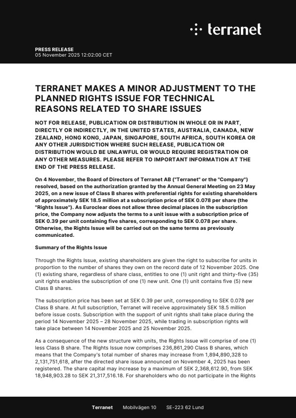 On 4 November, the Board of Directors of Terranet AB (“Terranet” or the “Company”) resolved, based on the authorization granted by the Annual General Meeting on 23 May 2025, on a new issue of Class B shares with preferential rights for existing shareholders of approximately SEK 18.5 million at a subscription price of SEK 0.078 per share (the “Rights Issue”). As Euroclear does not allow three decimal places in the subscription price, the Company now adjusts the terms to a unit issue with a subscription price of SEK 0.39 per unit containing five shares, corresponding to SEK 0.078 per share. Otherwise, the Rights Issue will be carried out on the same terms as previously communicated.