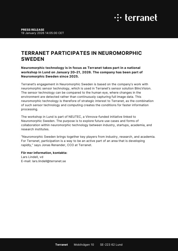 Terranet’s engagement in Neuromorphic Sweden is based on the company’s work with neuromorphic sensor technology, which is used in Terranet’s sensor solution BlincVision. The sensor technology can be compared to the human eye, where changes in the environment are detected rather than continuously capturing full image data. This neuromorphic technology is therefore of strategic interest to Terranet, as the combination of such sensor technology and computing creates the conditions for faster information processing.