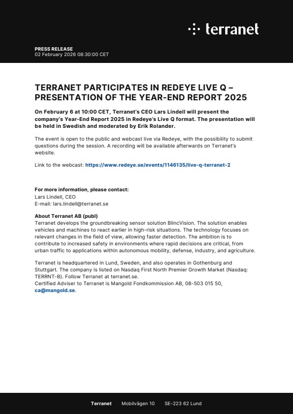 On February 6 at 10:00 CET, Terranet’s CEO Lars Lindell will present the company’s Year-End Report 2025 in Redeye’s Live Q format. The presentation will be held in Swedish and moderated by Erik Rolander.