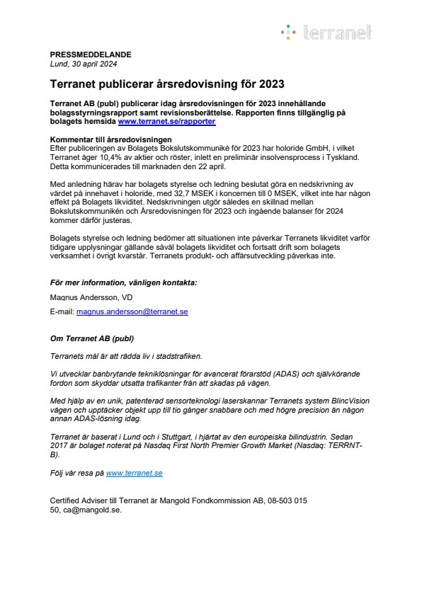 Efter publiceringen av Bolagets Bokslutskommuniké för 2023 har holoride GmbH, i vilket Terranet äger 10,4% av aktier och röster, inlett en preliminär insolvensprocess i Tyskland. Detta kommunicerades till marknaden den 22 april.