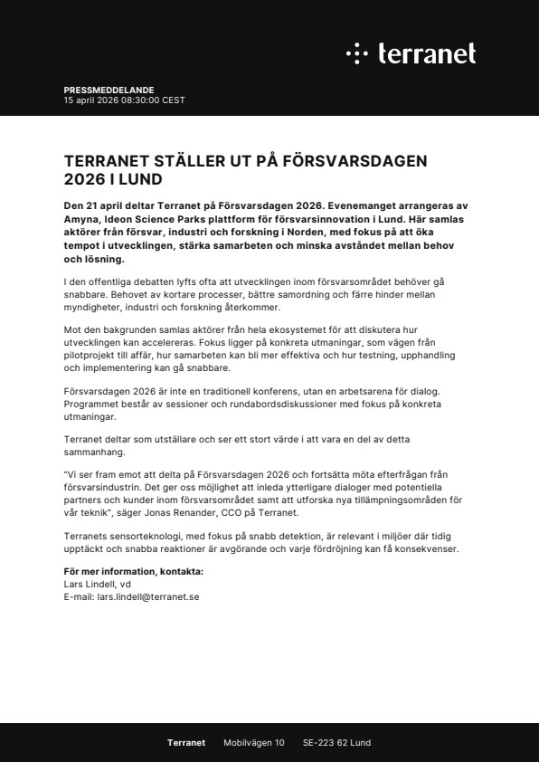 ”Vi ser fram emot att delta på Försvarsdagen 2026 och fortsätta möta efterfrågan från försvarsindustrin. Det ger oss möjlighet att inleda ytterligare dialoger med potentiella partners och kunder inom försvarsområdet samt att utforska nya tillämpningsområden för vår teknik”, säger Jonas Renander, CCO på Terranet.