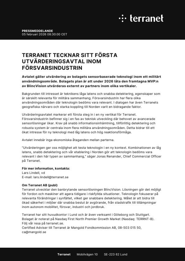 ”Utvärderingen ger oss möjlighet att testa teknologin i en ny kontext. Kombinationen av låg latens, snabb detektering och vår etablering i Norden gör att teknologin bedöms vara relevant i den här typen av sammanhang,” säger Jonas Renander, Chief Commercial Officer på Terranet.