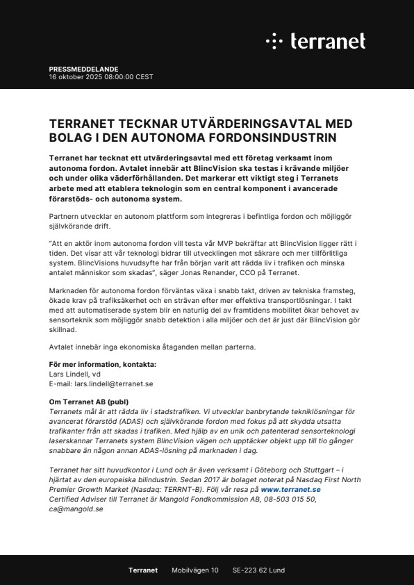 Terranet har tecknat ett utvärderingsavtal med ett företag verksamt inom autonoma fordon. Avtalet innebär att BlincVision ska testas i krävande miljöer och under olika väderförhållanden. Det markerar ett viktigt steg i Terranets arbete med att etablera teknologin som en central komponent i avancerade förarstöds- och autonoma system.