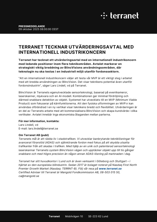 “Att en internationell industrikoncern väljer att testa vår MVP är ett viktigt steg i arbetet med att bredda användningen av BlincVision. Det visar teknikens potential även utanför fordonsindustrin”, säger Lars Lindell, vd på Terranet.