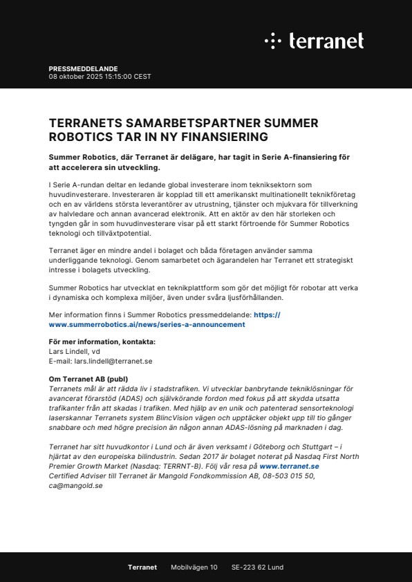 Mer information finns i Summer Robotics pressmeddelande: https://www.summerrobotics.ai/news/series-a-announcement