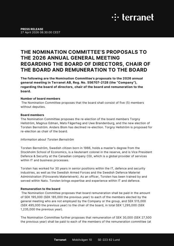 The following are the Nomination Committee’s proposals to the 2026 annual general meeting in Terranet AB, Reg. No. 556707-2128 (the “Company”), regarding the board of directors, chair of the board and remuneration to the board.
