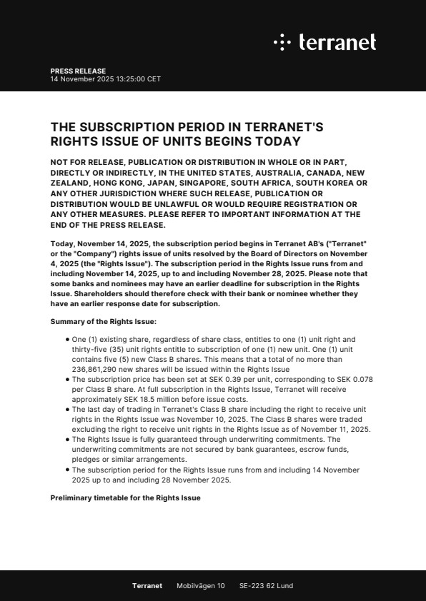 Today, November 14, 2025, the subscription period begins in Terranet AB’s (“Terranet” or the “Company”) rights issue of units resolved by the Board of Directors on November 4, 2025 (the “Rights Issue”). The subscription period in the Rights Issue runs from and including November 14, 2025, up to and including November 28, 2025. Please note that some banks and nominees may have an earlier deadline for subscription in the Rights Issue. Shareholders should therefore check with their bank or nominee whether they have an earlier response date for subscription.