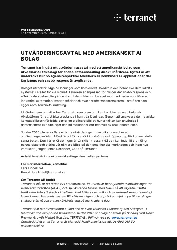 Terranet har ingått ett utvärderingsavtal med ett amerikanskt bolag som utvecklar AI-teknologi för snabb databehandling direkt i hårdvara. Syftet är att undersöka hur bolagens respektive tekniker kan kombineras i applikationer där låg latens och snabb respons är avgörande.